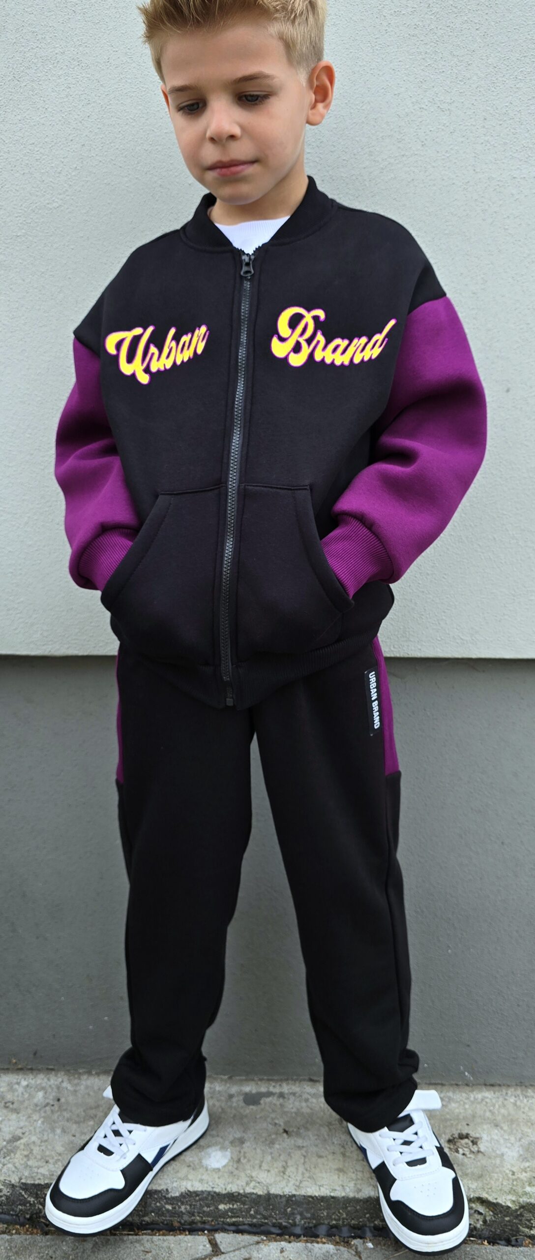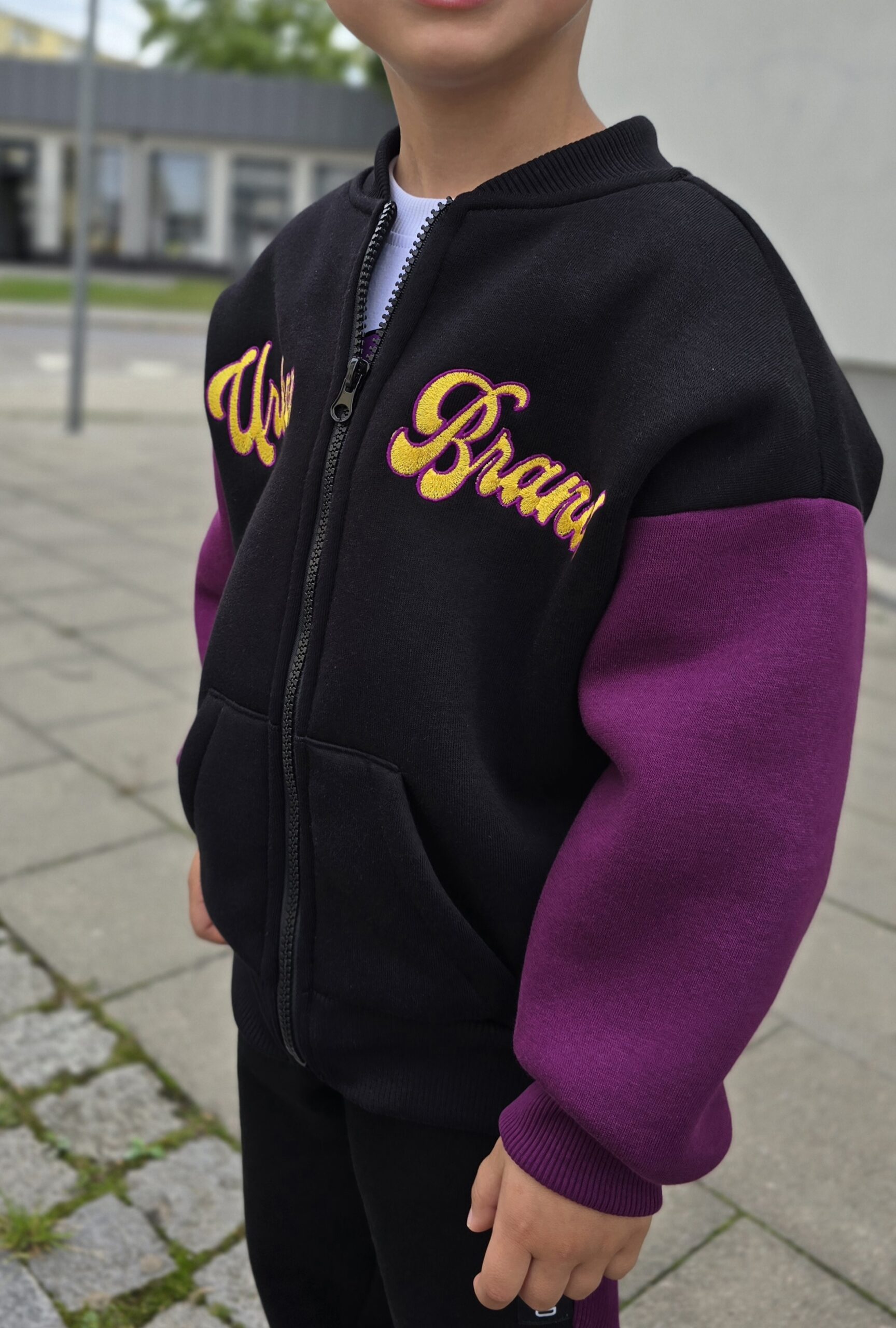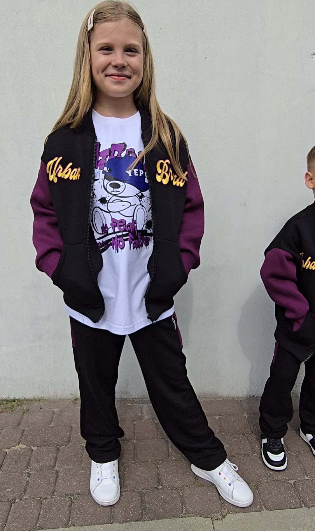 Bluza wykonana jest z wysokiej jakości dzianiny drapanej ( w środku meszek) w kolorze czarnym z fioletowymi rękawami.